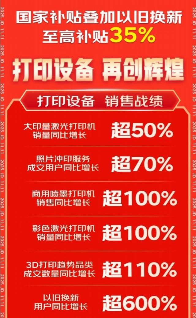 京东11.11打印设备享国家补贴叠加以旧换新至高补贴35%,助推打印设备销售再创新高。大印量激光打印机成交量同比增长超50%;照片冲印服务成交用户同比增长超70%;商用喷墨打印机成交额同比增长超100%;彩色激光打印机成交量同比增长超100%;3D打印趋势产品成交量同比增长超110%;以旧换新用户同比增长超6倍。