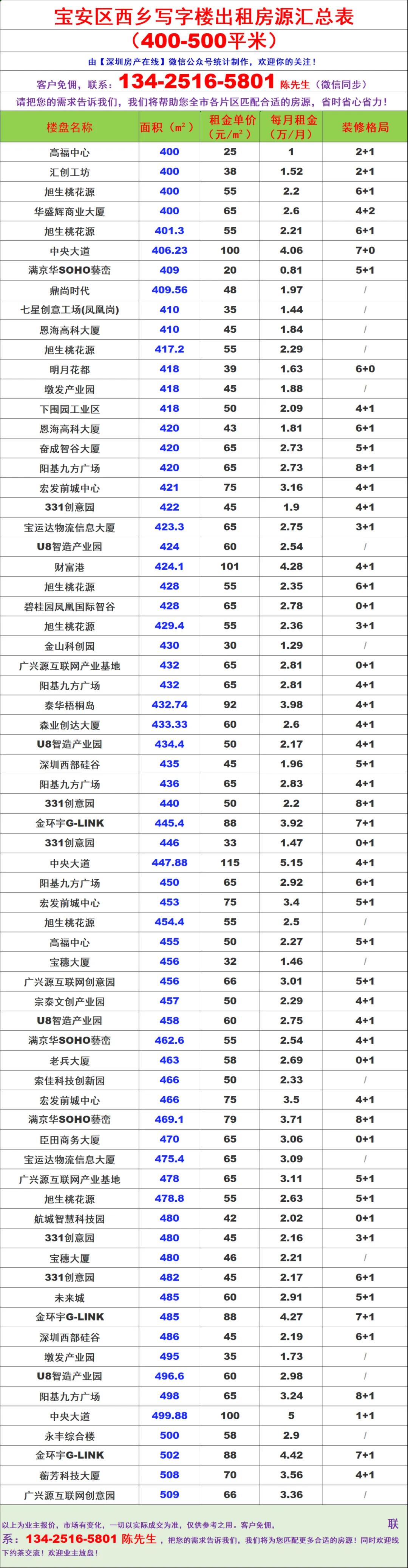 深圳宝安区西乡400-500平米写字楼出租招租赁信息