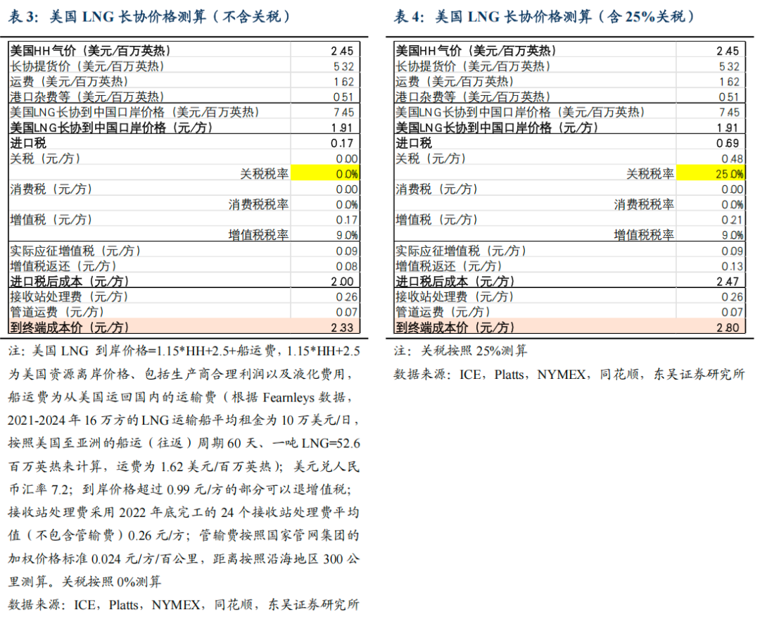 参考入库报告《自2/10起对美LNG加征15%关税,美LNG进口占比有限,加关税后仍具成本优势》,2024年美国LNG长协到达沿海地区终端用户的成本叠加25%关税将达2.80元/方,在沿海地区仍具0.08~0.55元/方的价格优势,价格优势显现。2024年中国自美国进口LNG约416万吨,占LNG进口总量约5.4%,占全国表观消费量约1.4%;占比较小,对整体供给影响有限。