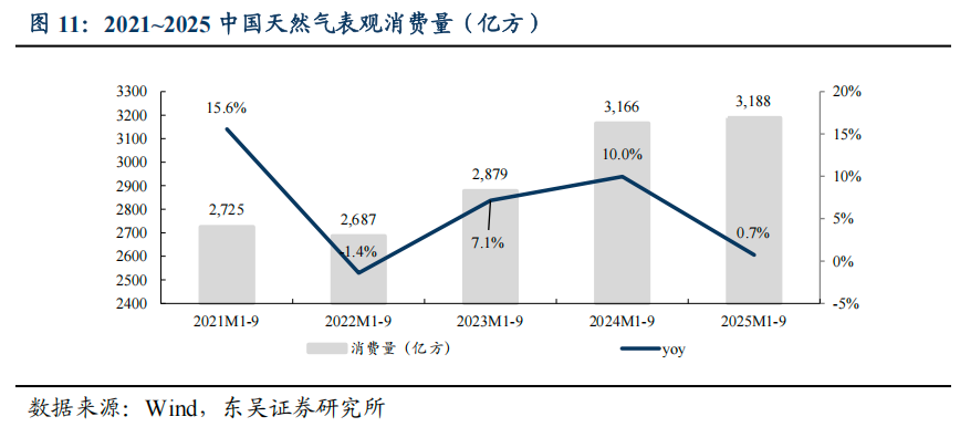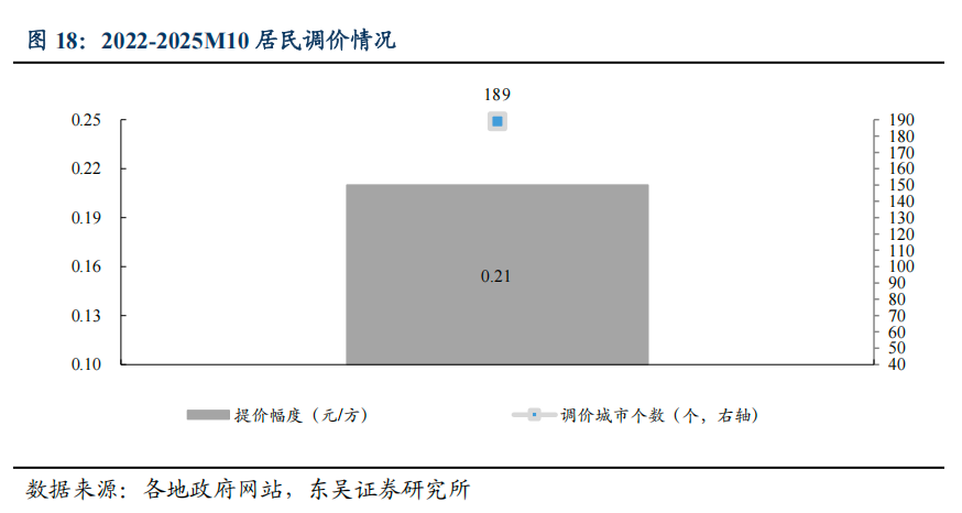 2022~2025M10,全国65%(189个)地级及以上城市进行了居民顺价,提价幅度为0.21元/方。2024年龙头城燃公司价差在0.53~0.54元/方,2025H1普遍修复0.01元/方,结合我们此前在报告《对比海外案例,国内顺价政策合理、价差待提升》中的测算,城燃配气费合理值在0.6元/方以上,价差仍存10%修复空间,顺价仍将继续落地。