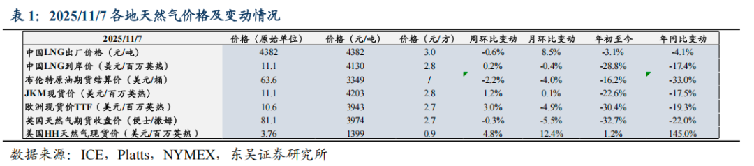 截至2025/11/07,美国HH/欧洲TTF/东亚JKM/中国LNG出厂/中国LNG到岸价周环比变动+4.8%/+3%/+1.2%/-0.6%/+0.2%至0.9/2.7/2.8/3/2.8元/方,海内外倒挂结束。