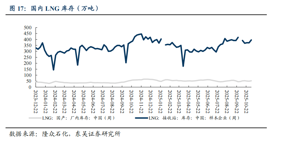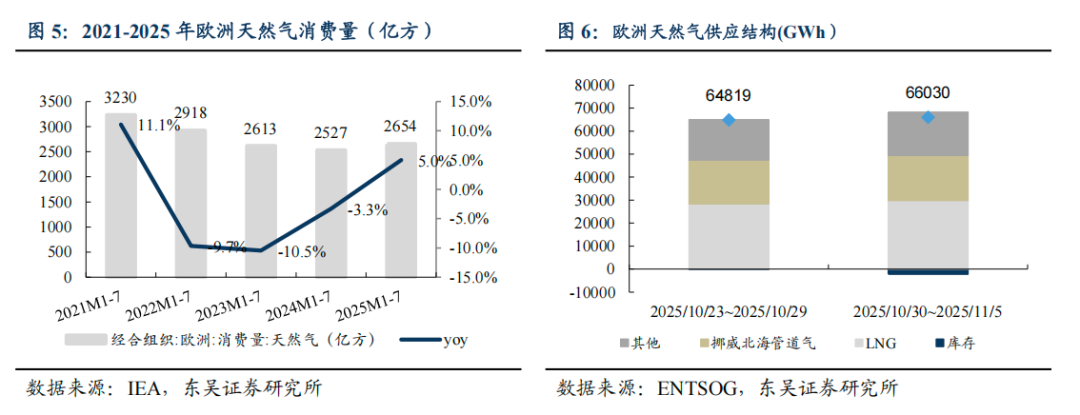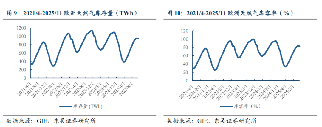 继续补库,欧洲气价周环比+3.0%。2025M1-7,欧洲天然气消费量为2654亿方,同比+5%。2025/10/30~2025/11/5,欧洲天然气供给周环比+1.9%至66030GWh;其中,来自库存消耗-2178GWh,周环比+1670.9%;来自LNG接收站29925GWh,周环比+5.4%;来自挪威北海管道气19591GWh,周环比+2.9%。2025/11/01~2025/11/07,欧洲燃气发电出力下降,欧洲日平均燃气发电量周环比+17.4%、同比-46.6%至973.7GWh。截至2025/11/05,欧洲天然气库存948TWh(916亿方),同比-139.8TWh;库容率82.97%,同比-11.8pct,周环比+0.2pct。
