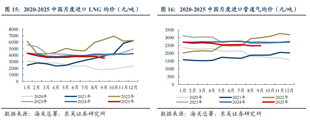 整体供应充足,冷空气对需求侧提振效果不明朗,国内气价周环比-0.6%。2025M1-9,我国天然气表观消费量同比+0.7%至3188亿方,原因或为2024年冬季偏暖,影响了2025M1-3采暖用气需求。2025M1-9,产量同比+6.5%至1949亿方,进口量同比-6.2%至1307亿方。2025年9月,国内液态天然气进口均价3560元/吨,环比-6.9%,同比-13.6%;国内气态天然气进口均价2490元/吨,环比+0.3%,同比-8.4%;天然气整体进口均价3047元/吨,环比-4.9%,同比-13.4%。截至2025/11/07,国内进口接收站库存395.39万吨,同比-9.59%,周环比+6.26%;国内LNG厂内库存52.7万吨,同比-12.39%,周环比+5.72%。