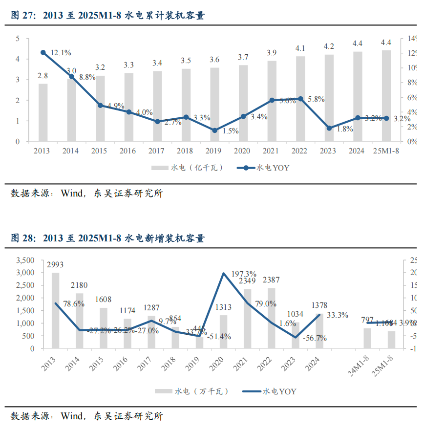 装机容量与利用小时数:截至8月31日,中国水电累计装机容量达到4.4亿千瓦,同比提升3.2%。2025年1至8月,中国水电新增装机容量684万千瓦,同比+3.9%。2024年1至12月,中国水电利用小时数3349小时,同比提升219小时。