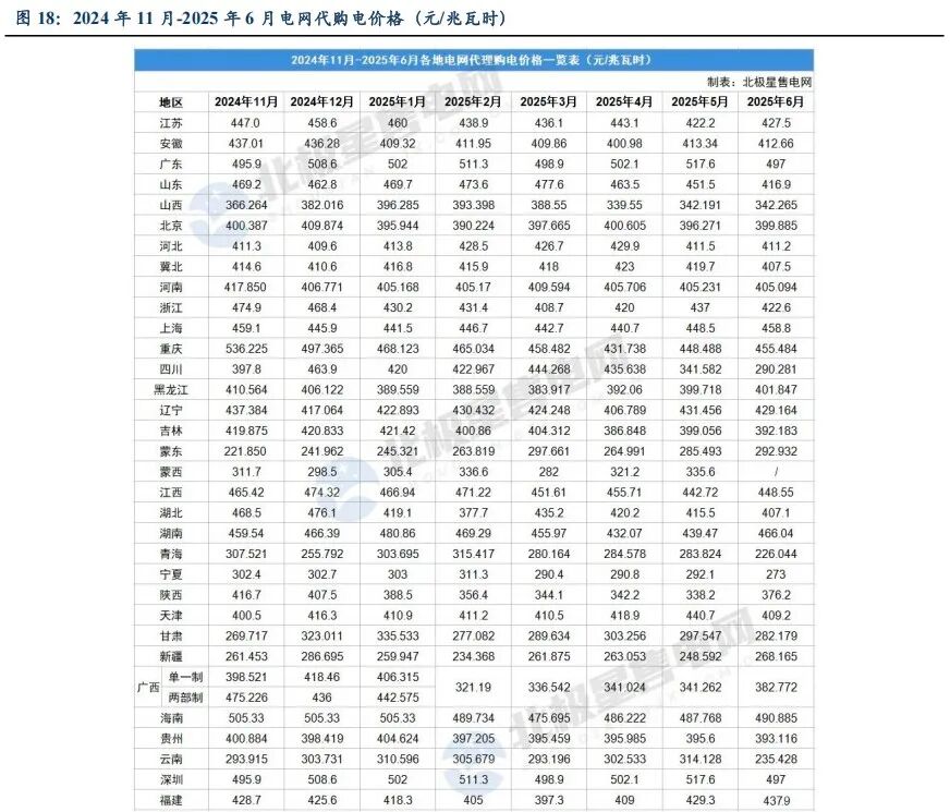 电网代购电价:2025年11月各省均价(算术平均数)401元/MWh,同比下降2%,环比上升1.8%。