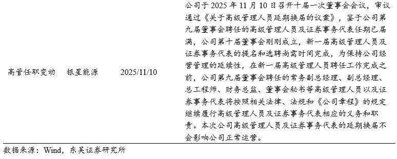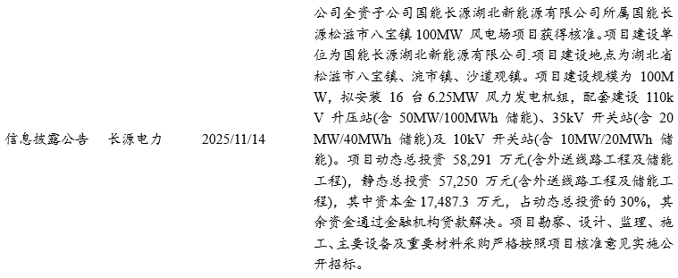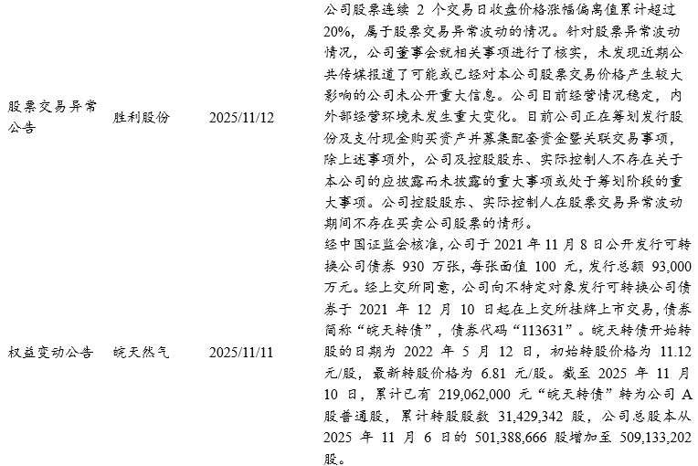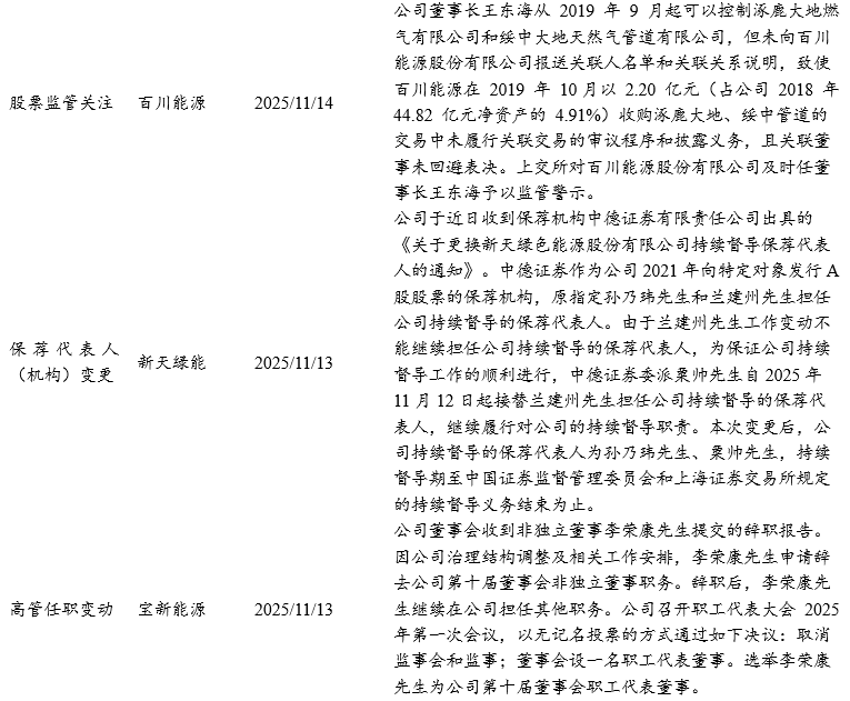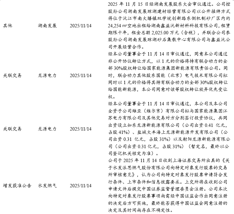 个股涨跌幅:个股涨跌幅:本周(2025/11/10–2025/11/14),涨幅前五的标的为:胜利股份(+46.6%)、首华燃气(+30.6%)、兆新股份(+20.9%)、百川能源(+17.3%)、国新能源(+16.3%)。跌幅前五的标的为:新筑股份(-8.4%)、上海电力(-6.9%)、国投电力(-5.6%)、天富能源(-5.5%)、ST金鸿(-4.6%)。