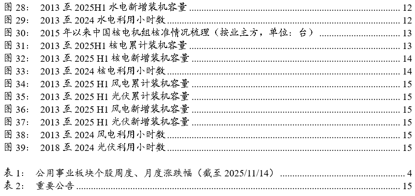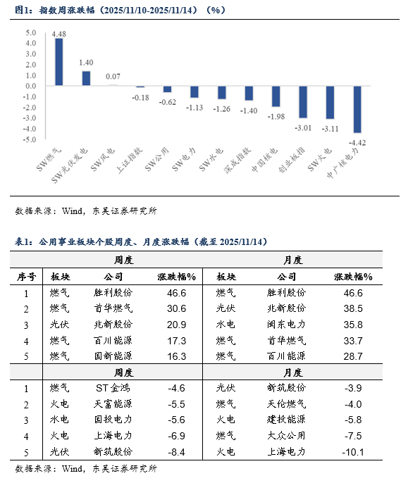 板块周行情:本周(2025/11/10-2025/11/14),SW公用指数下降0.62% ,从细分板块来看,SW光伏发电(1.40%)、SW风电(0.07%)、SW火电(-3.11%)、SW水电(-1.26%)、SW燃气(4.48%)、中国核电(-1.98%)。