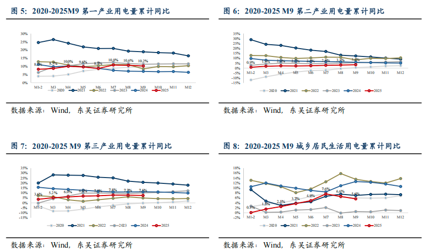 全社会用电量:2025M1-9全社会用电量7.77万亿千瓦时(同比+4.6%),同比增速较2025M1-8同比增速4.6%持平,其中,第一产业、第二产业、第三产业、居民城乡用电分别同比+10.2%、+3.4%、+7.5%、+5.6%。2025年用电量增速稳定。