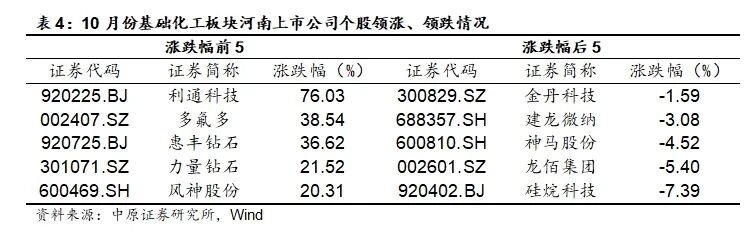 2025年10月,17家河南基础化工行业上市公司中,12家上涨,5家下跌,其中利通科技、多氟多、惠丰钻石、力量钻石和风神股份表现居前,分别上涨76.03%、38.54%、36.62%、21.52%和20.31%,硅烷科技、龙佰集团、神马股份、建龙微纳和金丹科技表现居后,分别下跌7.39%、5.40%、4.52%、3.08%和1.59%。