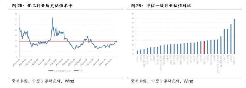 根据Wind数据,截止2025年11月14日,中信基础化工板块TTM市盈率(整体法,剔除负值)为29.07倍。2010年以来,行业估值平均水平为29.31倍,目前估值水平略低于历史平均水平。与其他中信一级行业横向对比,基础化工行业估值在30个行业中位居21位,维持行业“同步大市”的投资评级。11月份的投资策略,随着各行业反内卷整治的进一步深入以及稳增长措施的出台,化工行业供需格局有望进一步优化,建议两个维度寻找投资机会。
