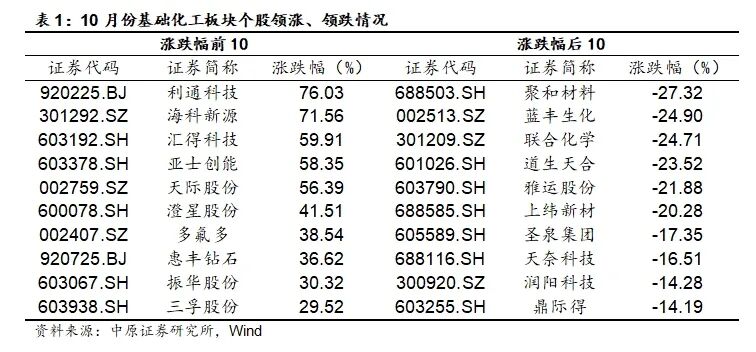 2025年10月,基础化工板块526只个股中,共有291支股票上涨,230支下跌。其中利通科技、海科新源、汇得科技、亚士创能和天际股份位居涨幅榜前五,涨幅分别为76.03%、71.56%、59.91%、58.35%和56.39%;聚合材料、蓝丰生化、联合化学、道生天合和雅运股份跌幅居前,分别下跌27.32%、24.90%、24.71%、23.52%和21.88%。