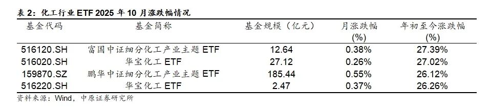 2025年10月,化工行业ETF全部上涨,其中鹏华中证细分化工产业主题ETF上涨0.55%。