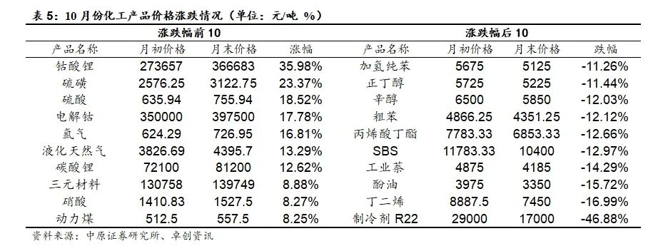 根据卓创资讯数据,2025年10月国际油价延续下行态势,其中WTI原油下跌2.23%,报收于60.98美元/桶,布伦特原油下跌2.91%,报收于65.07美元/桶。在卓创资讯跟踪的321个产品中,67个品种上涨,上涨品种较上月减少26个,涨幅居前的分别为钴酸锂、硫磺、硫酸、电解钴和氩气,涨幅分别为35.98%、23.37%、18.52%、17.78%和16.81%。216个品种下跌,下跌品种环比提升41个。跌幅居前的分别是制冷剂R22、丁二烯、酚油、工业萘和SBS,分别下跌了46.88%、16.99%、15.72%、14.29%和12.97%。总体上看,基础化工产品价格延续下跌态势。