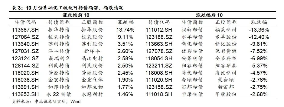 截至2025年11月14日,基础化工行业共有61只可转债标的。2025年10月,共有35支上涨,26支下跌,其中振华转债、杭氧转债、苏利转债、洋丰转债、晶瑞转2涨幅居前,分别上涨13.74%、9.11%、3.51%、2.60%和2.58%,福新转债、水羊转债、新化转债、优彩转债和安集转债跌幅居前,分别下跌13.36%、12.40%、9.81%、7.52%和6.99%。