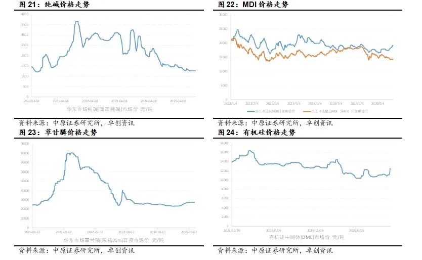 产品价格跟踪: 根据卓创资讯数据,2025年10月国际油价延续下行态势,其中WTI原油下跌2.23%,报收于60.98美元/桶,布伦特原油下跌2.91%,报收于65.07美元/桶。在卓创资讯跟踪的321个产品中,67个品种上涨,上涨品种较上月减少26个,涨幅居前的分别为钴酸锂、硫磺、硫酸、电解钴和氩气,涨幅分别为35.98%、23.37%、18.52%、17.78%和16.81%。216个品种下跌,下跌品种环比提升41个。跌幅居前的分别是制冷剂R22、丁二烯、酚油、工业萘和SBS,分别下跌了46.88%、16.99%、15.72%、14.29%和12.97%。总体上看,基础化工产品价格延续下跌态势。