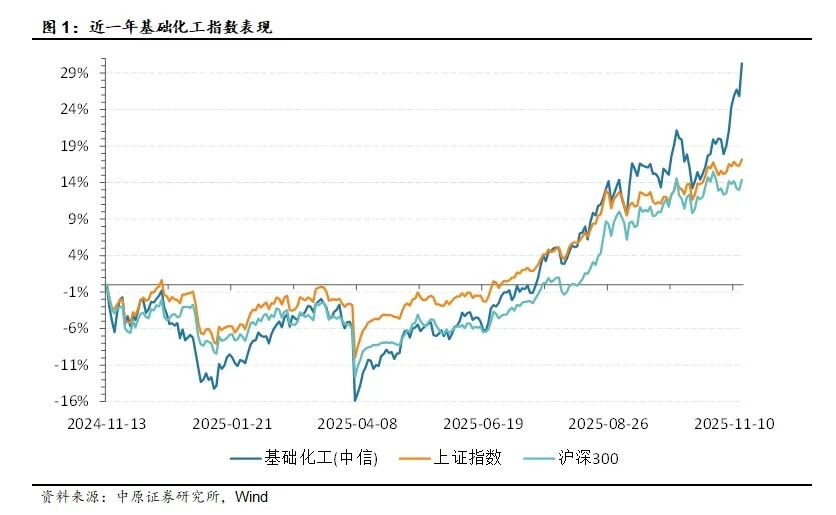 根据Wind数据,2025年10月中信基础化工行业指数上涨0.75%,跑输上证综指1.10个百分点,跑赢沪深 300 指数0.75个百分点,行业整体表现在30个中信一级行业中排名第18位。最近一年来,中信基础化工指数上涨28.58%,跑赢上证综指8.00个百分点,跑赢沪深 300 指9.31个百分点,表现在30个中信一级行业中排名第9位。