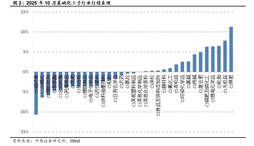 根据Wind数据,2025年10月,33个中信三级子行业中,15个子行业上涨,18个子行业下跌。其中钾肥、无机盐和轮胎行业表现居前,分别上涨11.27%、7.83%和6.51%,碳纤维、锦纶、橡胶助剂行业表现居后,分别下跌10.69%、6.39%和5.87%。