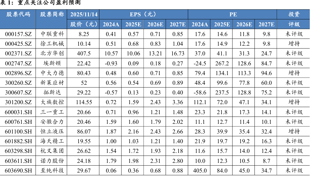 10 月挖机销量同比+7.77%,行业景气度持续改善。2025年10月销售 各类挖掘机18096台,同比增长7.77%。其中国内销量8468台,同比增长 2.44%;出口量9628台,同比增长12.9%。1—10月,共销售挖掘机192135 台,同比增长17%;其中国内销量98345台,同比增长19.6%;出口93790 台,同比增长14.4%。我们认为,行业层面,内需受益于新一轮集中换新 周期到来,以及雅下水电站等大型项目开工,以工代赈有望助力行业内需 向好。海外结构性景气,“一带一路”沿线国家的基础设施建设需求持续 增长,带动出口增长。龙头企业凭借“技术升级+全球化布局”双引擎, 海外市占率持续提升,中长期增长动能强劲。建议关注:徐工机械 (000425.SZ)、三一重工(600031.SH)、中联重科(000157.SZ)。