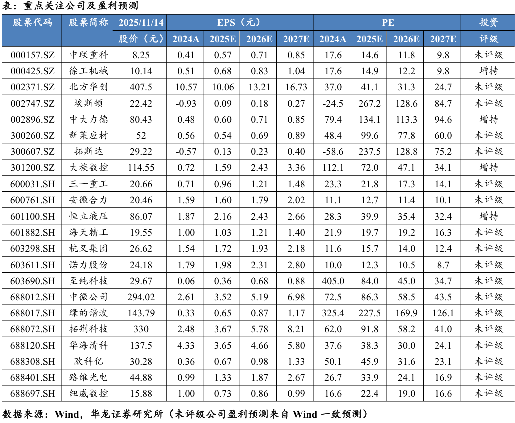 政策强力驱动,全球需求结构性复苏,国产机床高端化进程有望加快。一方面,国内“十五五”规划将工业母机列为需超常规攻关 的重点领域,工信部发文强调布局建设中试平台,一系列政策组 合拳将极大加速国产机床,特别是五轴联动、车铣复合等高端产 品的技术突破与产业化应用。另一方面,日本机床10月订单数据 连续17个月增长,且主要由出口驱动,提示全球高端制造投资复 苏的积极信号。在此背景下,建议重点关注那些在核心部件上具 备自研能力、产品线已覆盖高端领域、并能受益于全球资本开支 回升的龙头企业,如纽威数控(688697.SH)、大族数控 (301200.SZ)、海天精工(601882.SH)等。