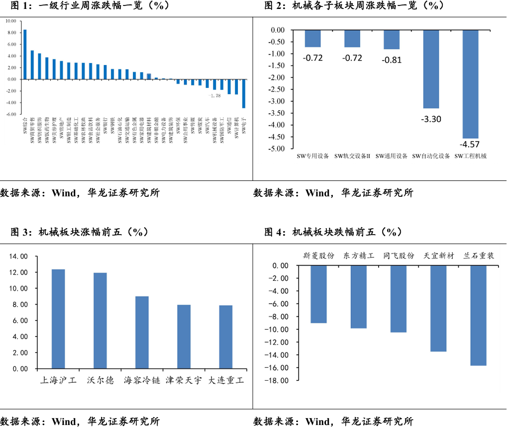 重点覆盖个股中,涨幅前五的公司分别为上海沪工(+12.35%)、沃 尔德(+11.93%)、海荣冷链(+9%)、津荣天宇(+7.94%)、大连重工 (+7.88%);跌幅前五的公司分别为兰石重装(-15.7%)、天宜新材(-13.5%)、同飞股份(-10.5%)、东方精工(-9.85%)、斯菱股份(-9.03%)。