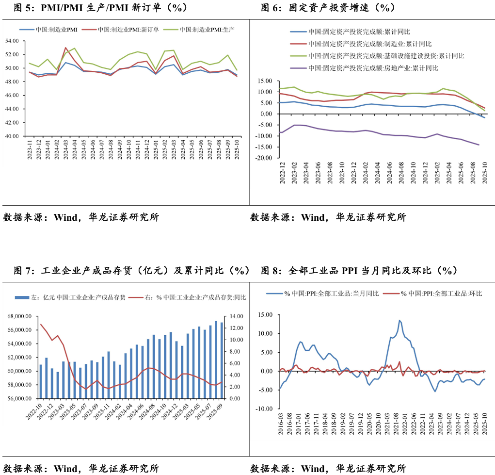 截至2025年10月,我国制造业PMI49%,同比-1.1pct,环比-0.8pct; 制造业新订单PMI48.8%,同比-1.2pct,环比-0.9pct;制造业生产PMI49.7%,同比-2.3pct,环比-2.2pct。