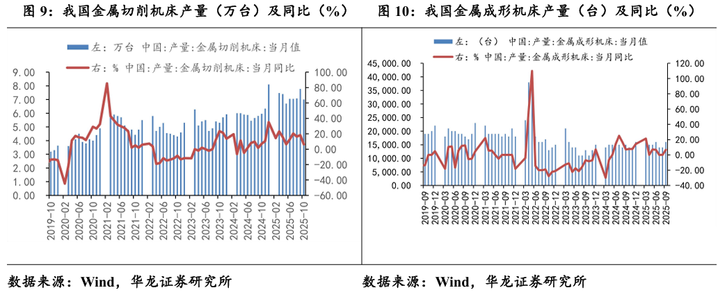 2025年10月,金属切削机床产量7万台,同比增加6.2%,连续十六 个月保持正增长;2025年9月金属成形机床产量1.6万台,同比增长6.7%。