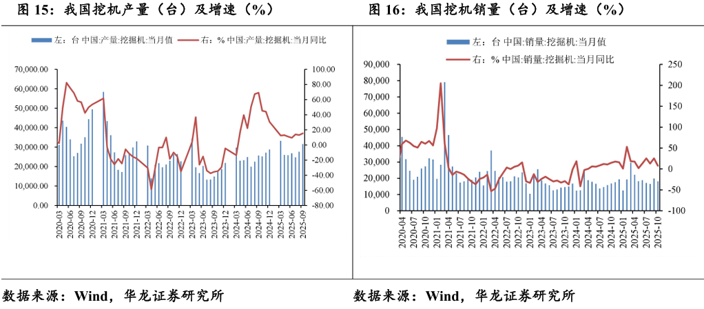 2025年9月,我国共生产挖掘机31608台,同比增长15.3%;2025年10月共销售挖掘机18096台,同比增长7.77%。2025年挖机销量快速增长, 行业复苏明显。