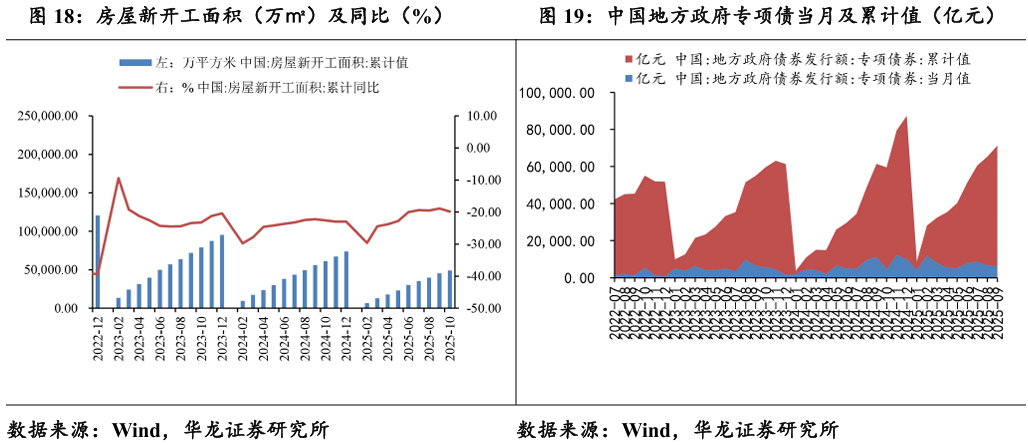2025年10月,我国房地产新开工面积累计49061万平方米,同比下 降19.8%;2025年9月地方政府专项债当月发行6359亿元,1-9月份累计 发行64900亿元,同比增长29.27%。