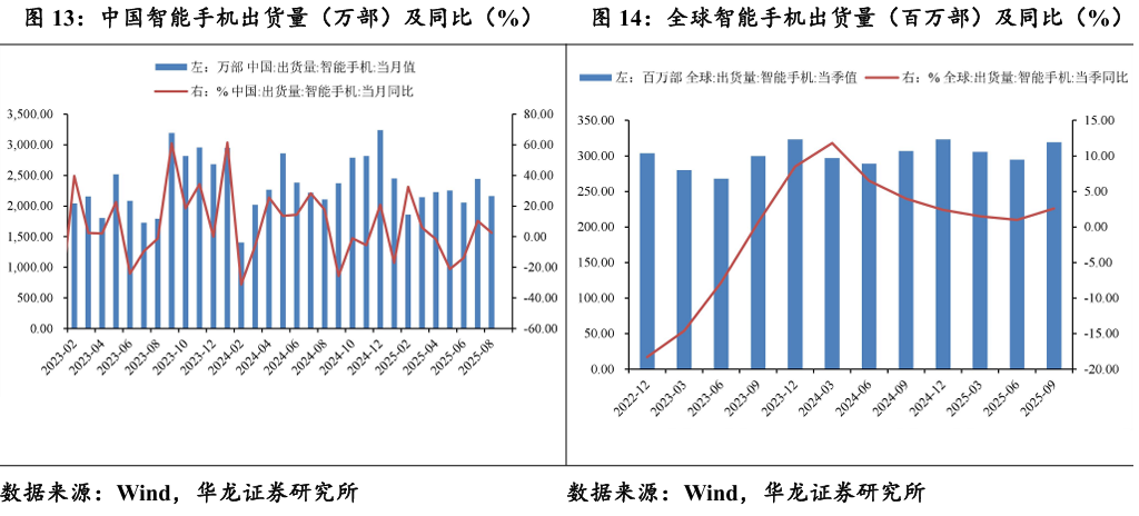 2025年8月,我国智能手机出货量2164.4万部,同比增长2.6%;2025 年第三季度全球智能手机出货319.3百万部,同比增加2.6%,增速连续九 个季度同比正增长,智能手机出货量复苏明显。