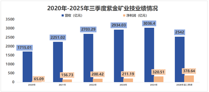 2025年前三季度,紫金矿业的矿产金产量达到65吨、矿产铜产量达到83万吨,带动公司总营收突破2500亿元。