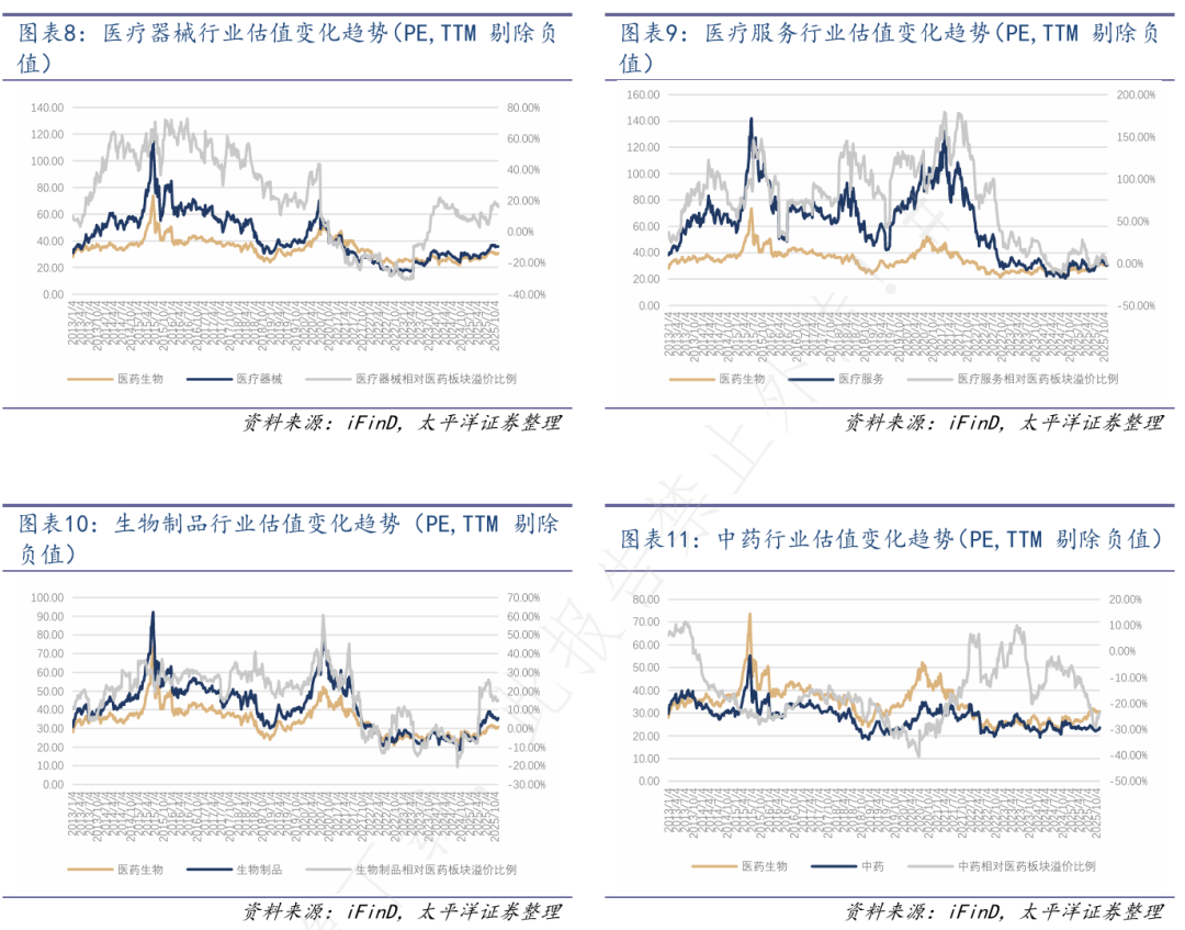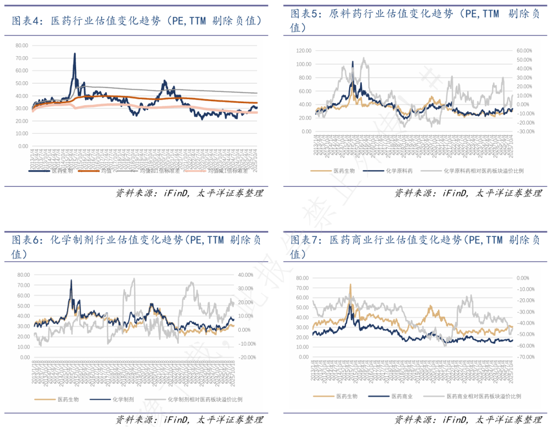 估值方面,截至11月14日收盘,以TTM整体法(剔除负值)计算,医药行业整体市盈率为30.84倍。医药生物相对于整体A股剔除金融行业的溢价率为25.08%。