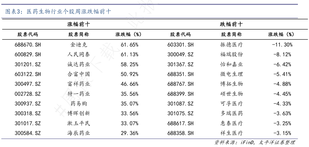 本周医药板块上涨3.29%,跑赢沪深300指数4.37pct。医药生物行业二级子行业中,医药商业(+7.31%)、药店(+6.83%)、创新药(+5.01%)表现居前,医疗设备(0.16%)、医疗新基建(1.18%)、医疗耗材(1.39%)表现居后。个股方面,周涨幅榜前3位分别为金迪克(+61.65%)、人民同泰(+61.13%)、诚达药业(+58.25%);周跌幅榜前3位为振德医疗(-11.30%)、福瑞股份(-8.12%)、怡和嘉业(-6.42%)。