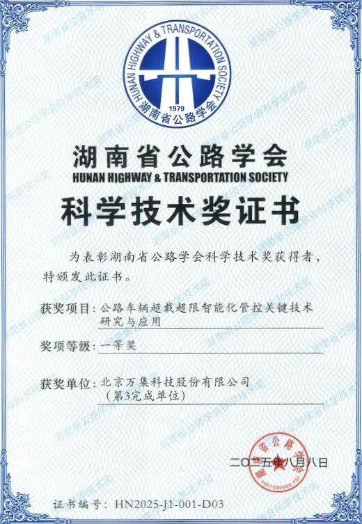 近日,由万集科技参与的科研项目《公路车辆超载超限智能化管控关键技术研究与应用》,荣获湖南省公路学会科学技术奖一等奖。项目历经十余年科研攻关,在动态称重、车辆外廓识别及智能化管控等关键环节实现了突破性创新,为我国公路治超工作数字化转型提供了坚实的技术支撑。