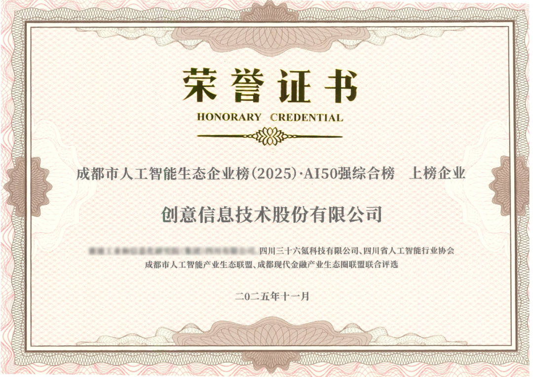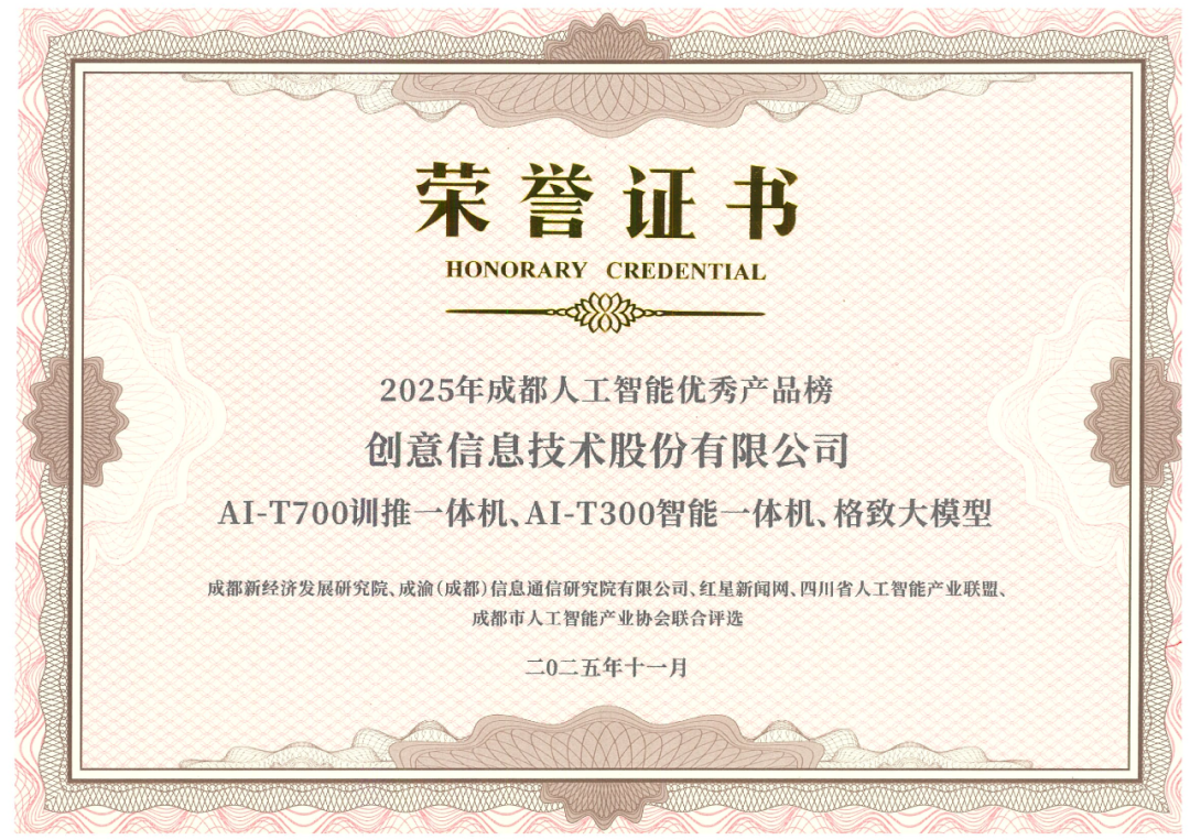 创意信息荣登“成都市人工智能生态企业榜(2025)·AI50强综合榜”,同时公司旗下AI产品——格致大模型、AI-T700训推一体机、AI-T300智能一体机荣登“2025年成都人工智能优秀产品榜”。