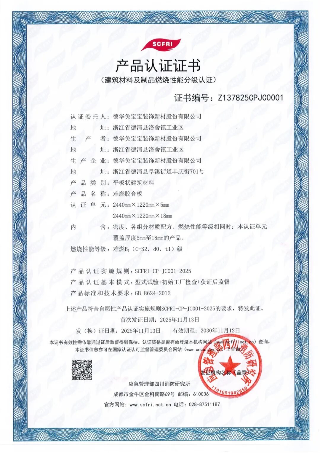 近日,兔宝宝难燃胶合板获得由应急管理部四川消防研究所颁发的行业首张“建筑材料及制品燃烧性能分级认证”难燃B1级证书。该认证严格遵循SCFRI-CP-JC001-2025实施规则与GB 8624-2012国家标准,标志着该产品继中国绿色产品认证后,再添一项权威安全背书,进一步彰显了公司在燃烧安全性能方面的卓越实力。