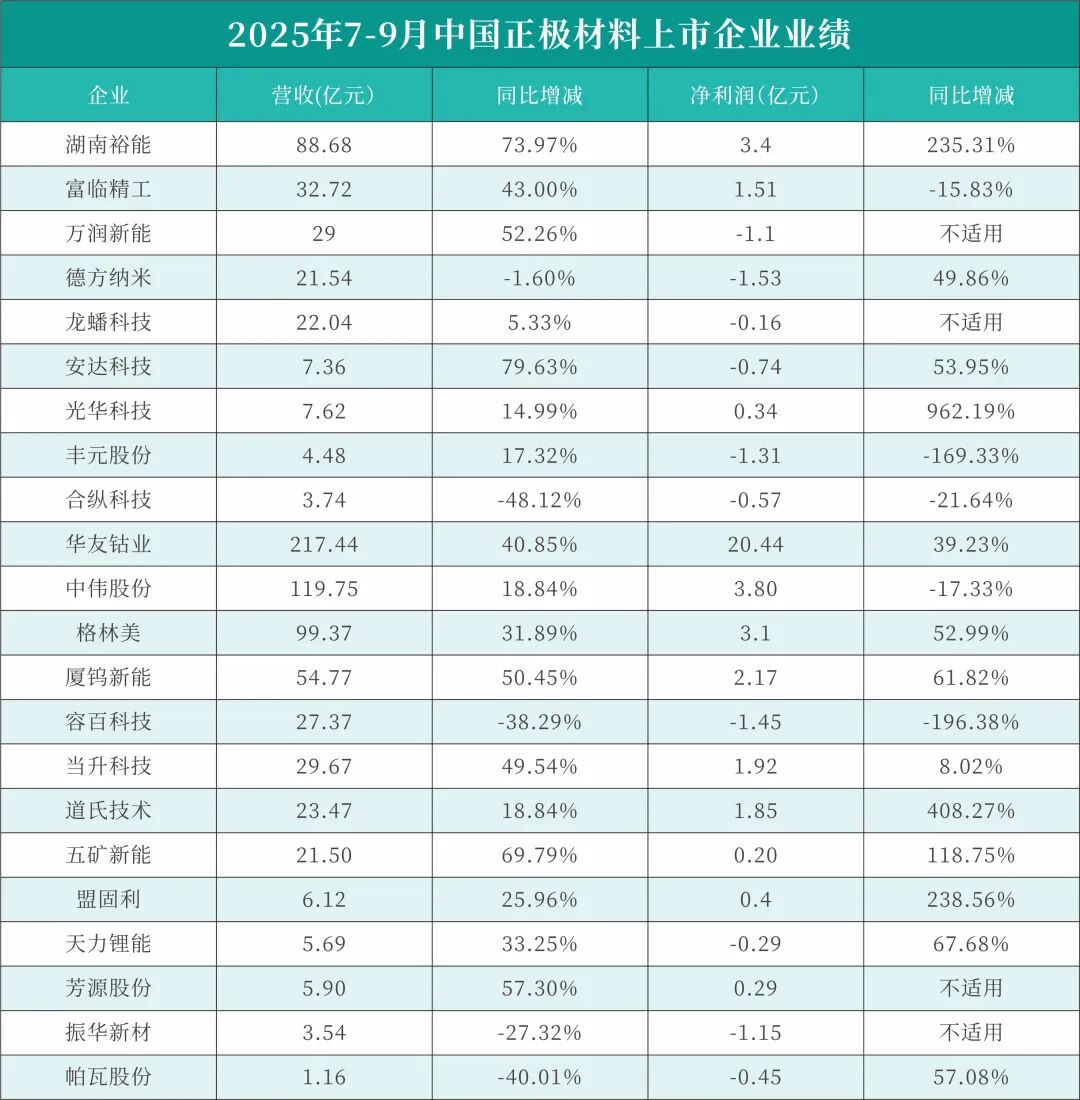 总的来看,2025年第三季度,湖南裕能等14家企业实现营收净利双增长(含亏损收窄和扭亏为盈企业);其中铁锂材料企业5家,三元材料9家;富临精工等3家企业处于增收不增利的尴尬状态;容百科技、合纵科技营收净利双降,德方纳米、振华新材、帕瓦股份虽然营收有所下降,但净利润反而实现增长(或亏损收窄)。