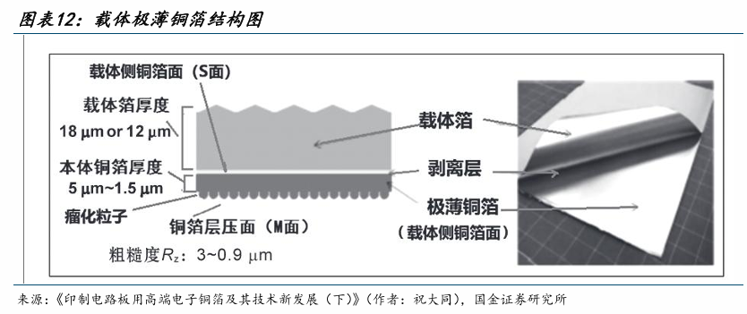 极薄铜箔(亦称载体铜箔/可剥离铜箔),一般指厚度在9um及以下的PCB铜箔,极薄铜箔HDI基板主要为微细线路基板(高阶产品应用主要为手机与通讯类)、IC封装基板、类载板(SLP)、模块基板等产品领域。为极薄铜箔在PCB加工中便于操作,以及保证基材(一般为半固化片/树脂膜)成形加工的质量,在极薄铜箔制造过程中,在极薄铜的光面(即S面)一侧附上与介质基材有一定接合力的载体(大都用铜箔材,也有采用铝材),因此构成的电解铜箔亦称为附载体极薄铜箔。
