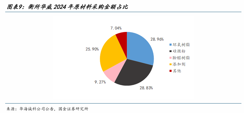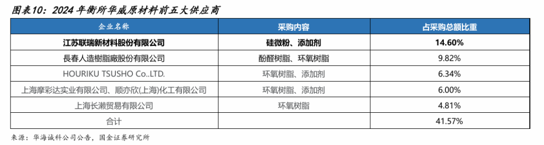 环氧塑封料主要原材料为硅微粉、环氧树脂、酚醛树脂、添加等,其他辅料材料包括包材、备件等,其中无机填料起到有效降低环氧塑封料热膨胀系数的作用。参考华海诚科收购标的衡所华威数据,2023-2024年其第一大供应商均为联瑞新材(采购硅微粉及添加剂),2024年硅微粉、添加剂分别占衡所华威原材料采购金额的比重为29%、26%。
