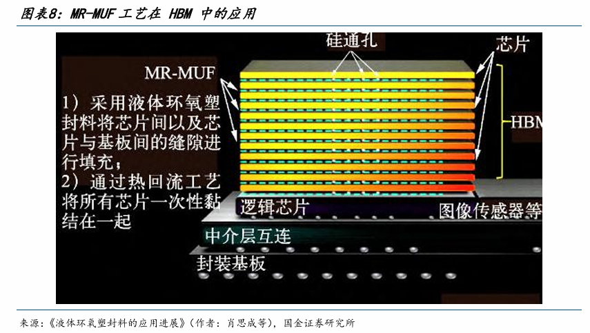 以存储为例,随着SK海力士从DRAM向HBM迭代,其HBM技术是大规模回流成型底部填充(MR-MUF)技术,将半导体芯片堆叠,在其缝隙中注入液体EMC(LEMC),并固化以保护芯片间电路。LEMC具有可中低温固化、低翘曲、模塑过程无粉尘、低吸水率及高可靠性等优点,是目前用 WLCSP技术的主要塑封材料,在WLCSP技术以及HBM产品中得到广泛应用。