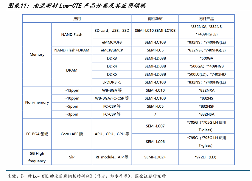 封装基板与PCB制造原理相近,具有高密度、高精度、高性能、小型化及薄型化等特点,是芯片封装不可或缺的一部分,为芯片提供支撑、散热和保护作用,同时也为芯片与PCB母板之间提供电气连接。以深南电路为例,其生产的封装基板产品主要应用于移动智能终端、服务器/存储等领域。(1)Low-CTE电子布Low-CTE,通信产品、消费电子等对于内部芯片集成度与算力速度提升,芯片的尺寸由小变大,在PCB组装焊接时会发生焊点开裂等问题,采用Low CTE材料可降低热应力、提高焊点可靠性。目前终端主要应用场景包括存储、FC-BGA、5G高频通信等领域。目前Low-CTE电子布已成为载板环节重要供给瓶颈。根据中国台湾工商时报消息,日商三菱化学发出通知,因Low-CTE玻纤布原料短缺、以及订单需求增加,导致其BT载板材料交期大幅拉长,目前部分Low-CTE玻纤布交期达16-20周。