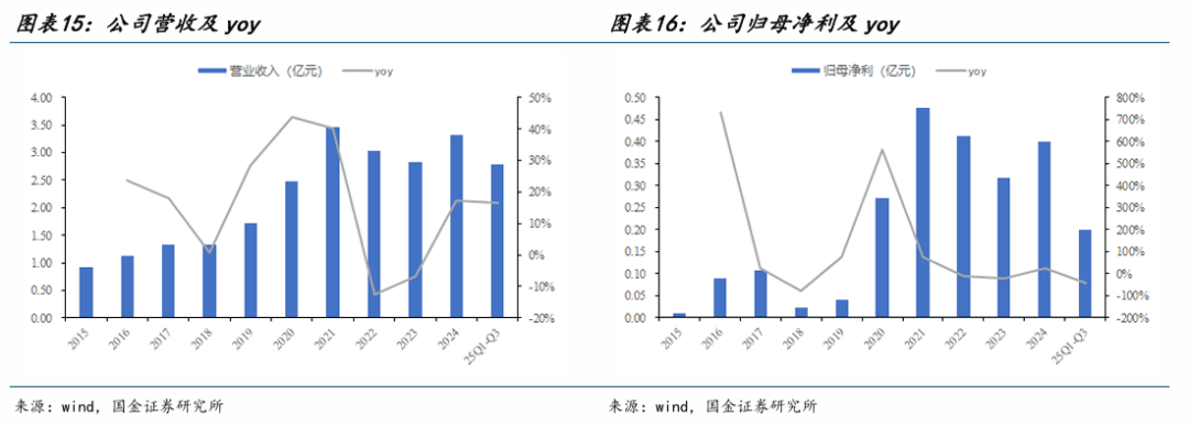 公司收入从2015年的0.91亿元增长至2024年的3.32亿元,CAGR为15.5%。2019-2021年公司收入处于快速增长期,2022-2023年受消费电子景气度放缓影响、收入同比负增,2024年公司收入已重回增长。25Q1-Q3公司实现收入2.79亿元、同比+17%。