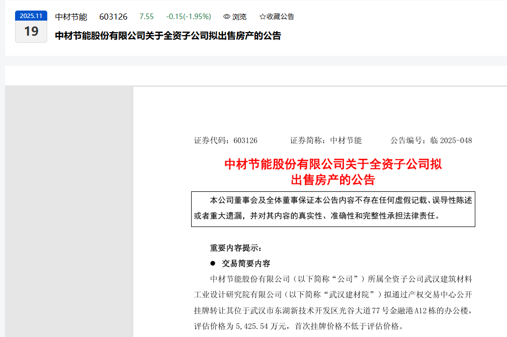 中材节能的一家全资子公司(武汉建材院),打算把它在武汉的一栋办公楼给卖了。