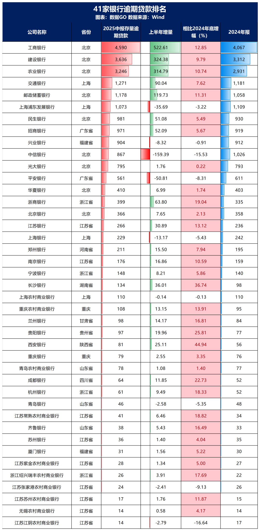 •多数银行 2025 年中报逾期贷款存量高于 2024 年报,说明行业整体逾期贷款规模呈增长趋势;