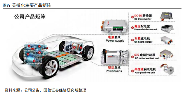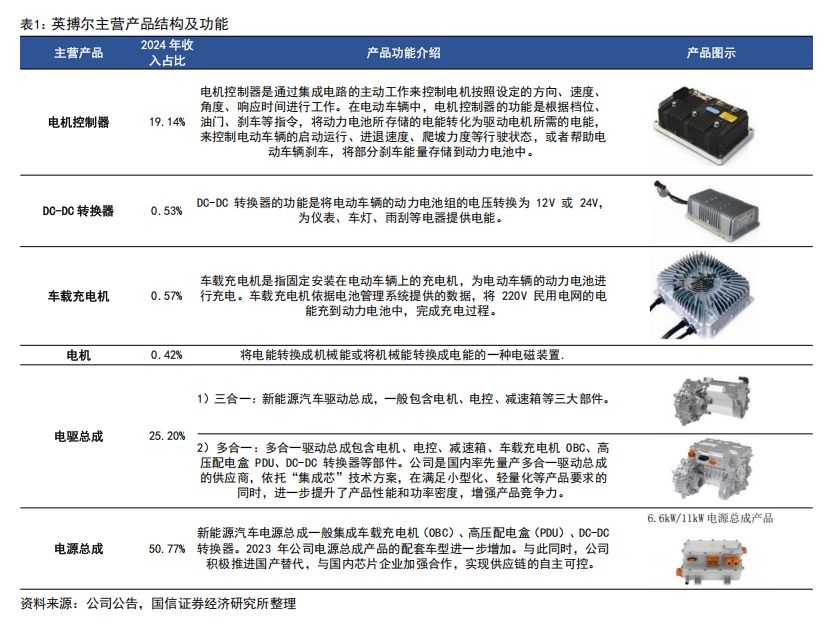 英搏尔主营产品为新能源汽车动力总成、电源总成以及驱动电机、电机控制器、车载充电机、DC-DC转换器等新能源汽车动力域核心零部件。