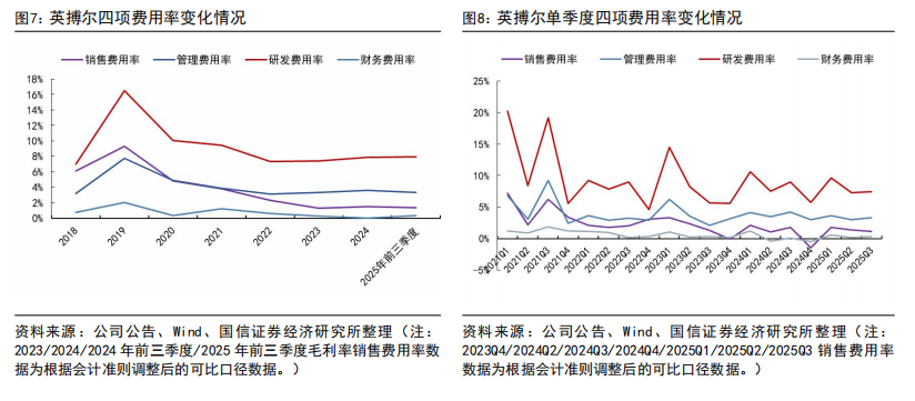2025Q3,公司四费率同比-2.8pct。2025年前三季度,公司四费率为12.96%,同比-1.89pct,其中销售/管理/研发/财务费用率分别为1.39%/3.32%/7.92%/0.33%,同比分别变动-0.26/-0.64/-1.06/+0.07pct。分季度看,2025Q3,公司四费率为12.32%,同比-2.81pct,环比+0.44pct,其中销售/管理/研发/财务费用率分别为1.16%/3.36%/7.47%/0.35%,同比分别变动-0.63/-0.86/-1.54/+0.22pct,环比变动-0.21/+0.33/+0.15/+0.17pct。