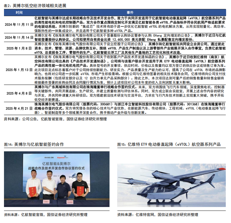 2025年9月,公司与亿航智能成立的合资子公司云浮英航厂房基建基本完成,已进入试产阶段;EH216-S机型已完成电机、电调的小批量交付。10月亿航智能发布新机型VT35,目前VT35电推进系统样机已经交付。同时,公司和亿维特以及高域的样机开发进展顺利。