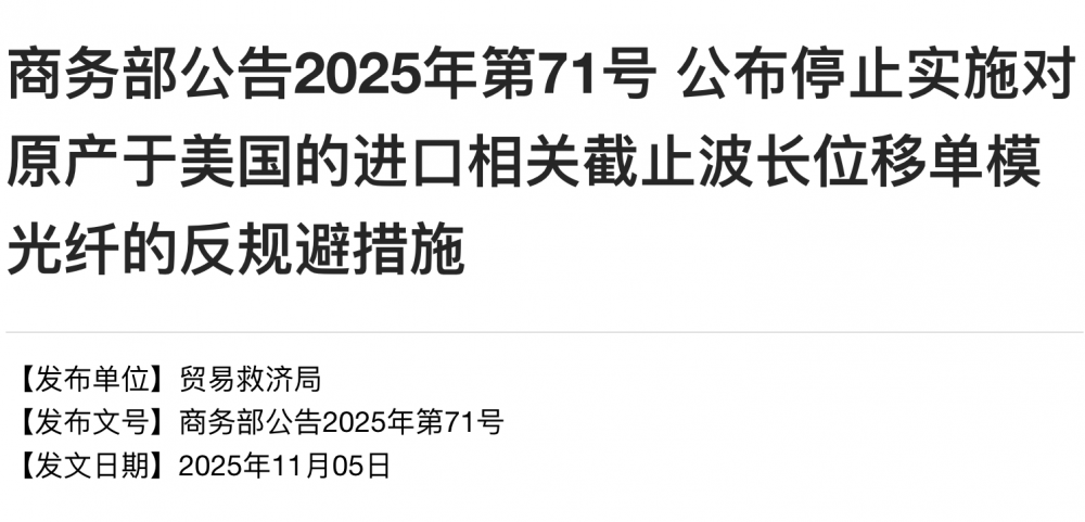 11月10日消息,商务部公告2025年第71号公布停止实施对原产于美国的进口相关截止波长位移单模光纤的反规避措施。