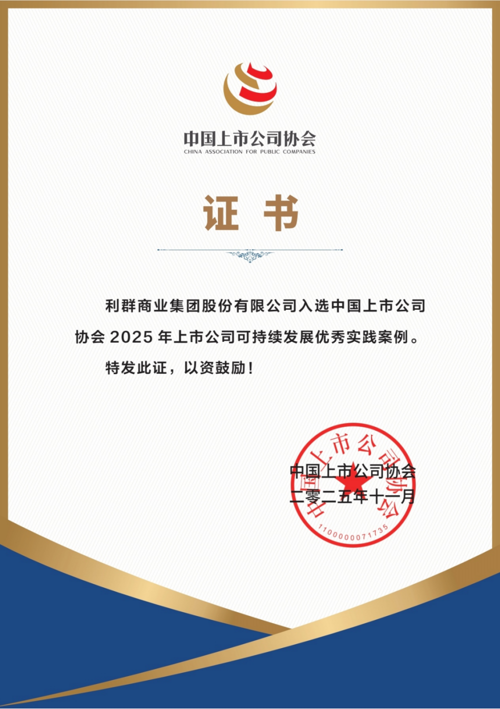 2025年11月19日,中国上市公司协会发布了“2025年上市公司可持续发展优秀实践案例”征集活动结果,利群股份荣获“可持续发展优秀实践案例”。