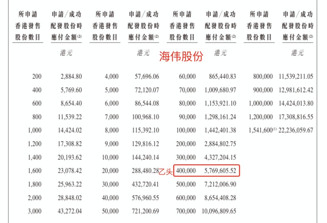 海伟股份招股首日孖展72倍,最终大概率会超购5000倍,甲乙组各7708手。按照20万人申购算,预估一手中签率1%,甲组全部抽签。