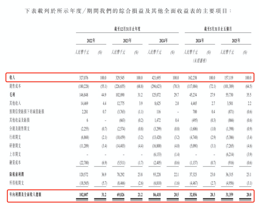 财务数据显示:2022年至2024年,海伟股份收入从3.27亿元增长至3.30亿元,再到4.22亿元人民币,2024年同比增长达到27.9%。然而,2025年前五个月,公司收入为1.57亿元,同比小幅下降3.2%,显示出短期增长压力。